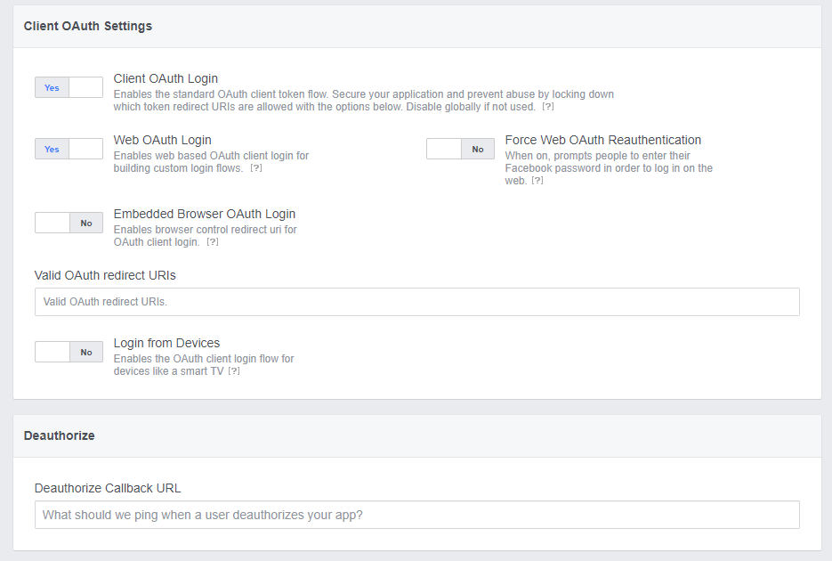 Fill the Valid OAuth redirect URIs with the Redirect URI provided by Lliege ID External Provider's page, available in the Facebook panel, and select Save Changes.