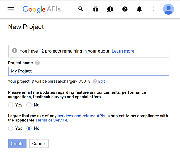 Go to your Google Cloud Plaform library and select the Create button (you may need to log in first):