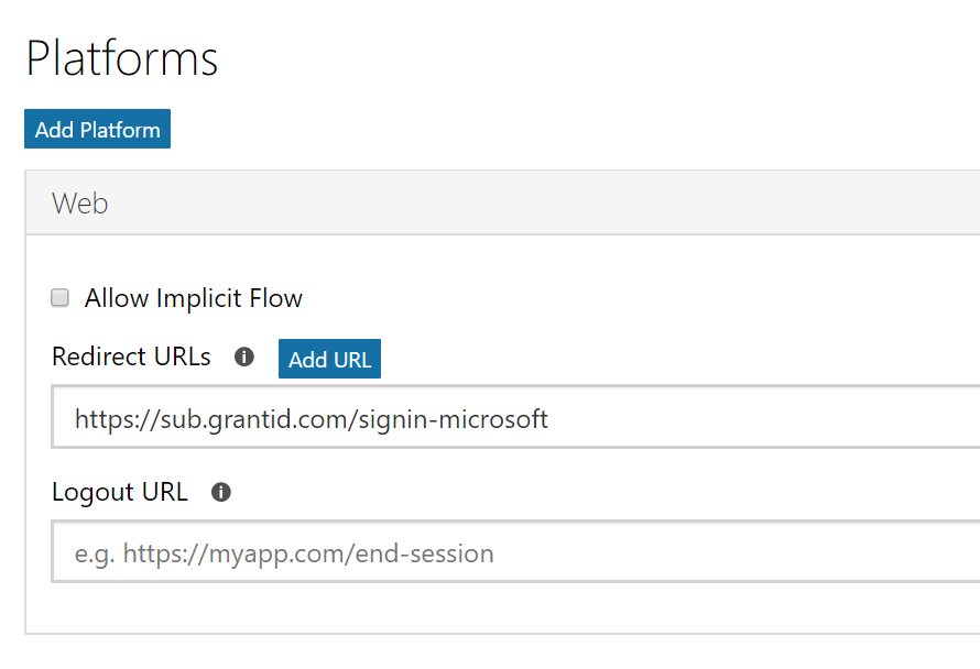 A new panel named Web will be created under the Platforms section. The Redirect URL is available in the Microsoft panel of the Lliege ID External Provider's page.
