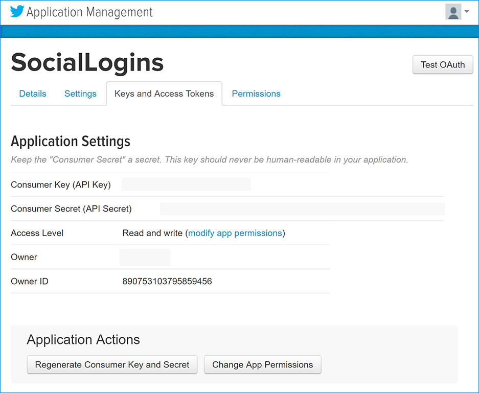 Go to the Keys and Access Tokens tab, where your twitter app information will be displayed.